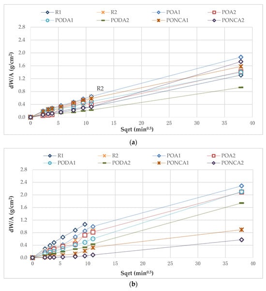 From the conduction of the capillary test, the capillary coefficient c was calculated (UNI EN15801:2010), while after the drying test was concluded, the drying index ID test was calculated as well (EN 16322:2013) [,]. The process, the necessary equations, and the interpretation of the results of the drying test were described in a previous study by the authors []. Moreover, after the implementation of the Karsten tube penetration test, the average water penetration of each sample was calculated.