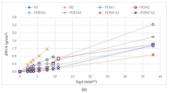 Capillary absorption of the mortars at (a) 28 days; (b) 180 days; (c) 365 days.