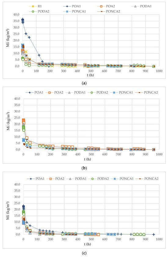 Drying curves of the first phase of the mortars at (a) 28 days; (b) 180 days; (c) 365 days.