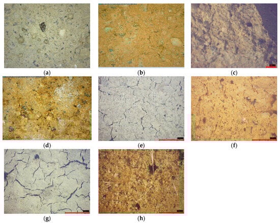 Stereoscopic observations of the mortars after the combined cycles durability test (scale 1000 μm): (a) R1; (b) R2; (c) POA1; (d) POA2; (e) PODA1; (f) PODA2; (g) PONCA1; (h) PONCA2.