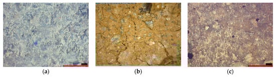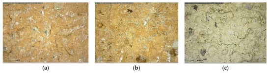 After the salt cycles, the surfaces of the compositions exhibited severe tarnishing and cracking, along with exposed aggregates and structural disintegration (Figure 8). Furthermore, a more intense formation of salts was observed in the case of the R2 compositions overall (POA2, PODA2, PONCA2). Discoloration and severe surface weathering were noted in the compositions, after completing the combined cycles (Figure 9). White deposits were observed on the PODA1 and PONCA2 compositions, while the PONCA1 composition exhibited more pronounced crack development with an opening of 64.66 μm.