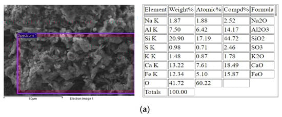 SEM examination of the produced mortars revealed that the reference mortar R1 had a loose crystal structure with a smooth surface, whereas composition R2 displayed a moderately rough surface (Figure 10a,b). The EDS analysis revealed that composition R2 had a high content of silicon and aluminum, along with traces of calcium, iron, magnesium, potassium, and sodium. As anticipated, composition R1 also showed a high percentage of silicon and calcium, along with moderate levels of calcium and iron, and small amounts of sodium and potassium.