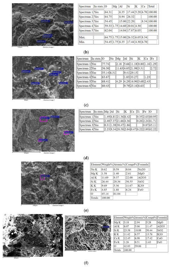 Finally, the surface alterations of the mortars were observed stereoscopically using a LEICA WILD M10 microscope at 90 and 365 days. To determine changes in the inner structure, a microscopic examination was conducted using a scanning electron microscope (SEM, JEOL840A JSM, JEOL, Tokyo, Japan) equipped with an EDS device. Additionally, various molar ratios were estimated after one year. Numerous studies have investigated the specific limits of these ratios, with Davidovits primarily proposing ratios for the activation of metakaolin systems using sodium hydroxide and water glass. He also suggested the following average molar ratios for the mortars: Si/Al: 2.854 (2.047–5.57), K/Al: 0.556 (0.306–0.756), Si/K: 6.13 (3.096–9.681), Ca/Al: 0.286 (0.107–0.401), and Si/Ca: 15.02 (4.888–41.267) [,]. Moreover, research by Xu and Deventer suggests that the percentages of CaO and K2O, along with the Si/Al ratio in the original mineral, are correlated with the development of compressive strength [].