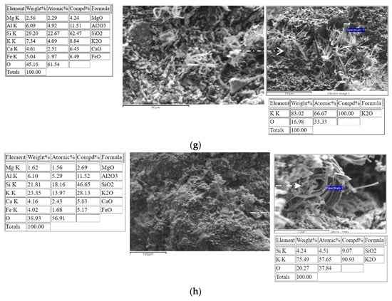 SEM images of the mortars at the age of 365 days from EDS analysis (scale varies from 60 to 400 μm): (a) R1; (b) R2; (c) POA1; (d) POA2; (e) PODA1; (f) PODA2; (g) PONCA1; (h) PONCA2.