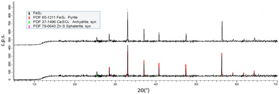 X-ray diffraction spectrum of pyrite particles. (Analysis conditions: radiation—Cu Ka1 (λ = 1.5406 Å); voltage—40 Kv; intensity—30 mA. Detector: scintillation; scan range: 5–70° 2Ө; step size: 0.020° 2Ө; step time: 1 s).