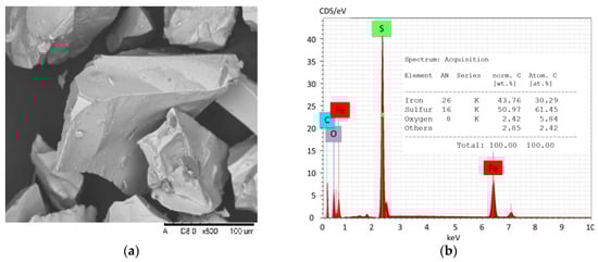 SEM micrograph of pyrite particles (a) and EDS spectrum (b).