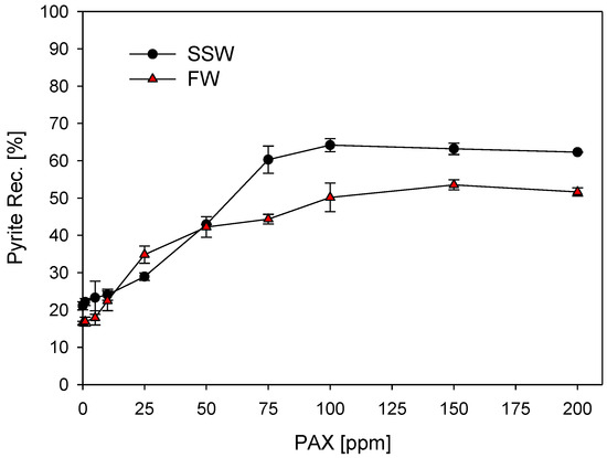 Pyrite recovery vs. PAX concentration in FW and SSW (test conditions: 20 ppm MIBC).