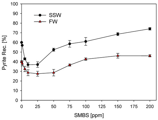 Pyrite recovery reaches a minimum of ca. 28% in freshwater with SMBS between 10 and 50 ppm. At doses greater than 50 ppm, the recovery increases rapidly until reaching 40% at 100 ppm, the initial value without SMBS. Recovery is maintained at 40% with SMBS between 100 and 200 ppm. The loss of a ca. 12% pyrite recovery with SMBS between 10 and 50 ppm originates from sulfite ions which, in the presence of sufficient oxygen, lead to hydrophilic sulfates () and dithionate () after a long chain of possible reactions [21]. Interestingly, in freshwater with 100 ppm SMBS, pyrite recovery is the same as without SMBS.