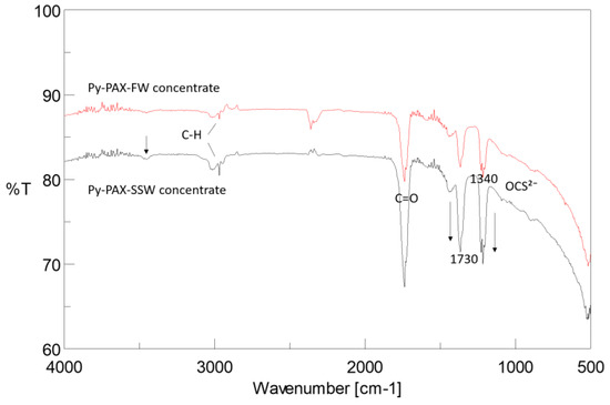 FTIR spectrum analysis. Red line: pyrite concentrate with PAX-MIBC in freshwater (FW); black line: pyrite concentrate with PAX-MIBC in synthetic seawater (SSW).