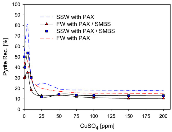Figure 7 shows the effect of copper ions on pyrite recovery in four cases: freshwater with PAX, seawater with PAX, freshwater with PAX and SMBS, and seawater with PAX and SMBS. The flotation conditions that maximize recovery include 75 ppm PAX and 20 ppm MIBC. The SMBS dose is 10 ppm, a concentration at which the depressant effect is stronger, as Figure 5 shows.