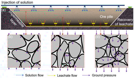 The typical surface heap leaching development and production process is shown in Figure 1a. Generally, at the selected site, the first step is to carry out the anti-seepage layer operation, lay down the leachate collection pipeline, and pretreat the ore particles before stacking the ore heap. The height of the heap varies from tens of meters to more than a hundred meters, depending on the production scale. After the heap is built, the leaching solution spraying pipeline is laid down. The leaching solution infiltrates from the surface of the ore heap to the bottom layer, reacts with the ore to generate ore-containing leachate, and is finally recovered through the collection pipeline. Due to the influence of the overlying rock layers, the stress on the ore gradually increases, the pore volume between the ores decreases, and stress analyses are conducted on three rock mass regions at different buried depths, as shown in Figure 1b–d. The magnitude of the stress on the rock mass is related to the density and thickness of the overlying rock layers and can be calculated using Equation (1):