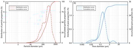 (a) Particle distribution and (b) pore distribution characteristic curves of the original samples.