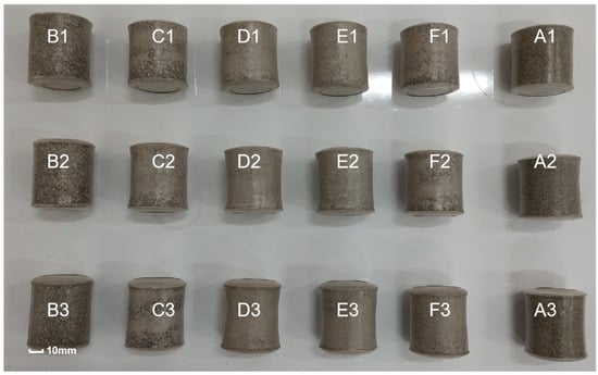 According to engineering conventions, loose sandstone particles are usually classified into silt, fine sand, medium sand, coarse sand, and fine gravel during research. Their particle size ranges are as follows: 0–0.15 mm, 0.15–0.3 mm, 0.3–0.6 mm, 0.6–1.2 mm, and above 1.2 mm. As shown in Table 1a, using the passable particle sizes of the 0–2.4 mm standard sandstone sieve set as a reference, the rock samples were divided into 5 segments based on the particle distribution curve in Figure 2a. The particle mass corresponding to each group of rock samples is shown in Table 1b (after sieving out particles from a certain segment, the particle mass of other segments is increased in the original proportion to maintain a consistent mass for each group of rock samples). Based on this, assuming a heap leaching site with a height of 100 m, the rock samples were pressurized at depths corresponding to the surface (0 m), shallow (10 m), medium (50 m), and deep (100 m) depths, resulting in 5 experimental groups, B–F, and the original rock sample group, A, as a control, as shown in Table 1c. In the calculation of stress, for ease of comparison, the density ρ of the overlying rock layer was uniformly set to 1690 kg/m3.