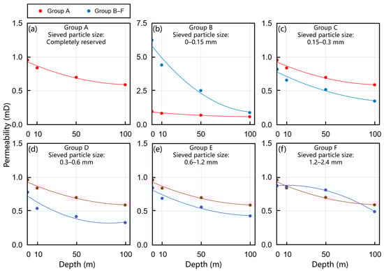 Depth–permeability relationship. (a) Group A; (b) Group B; (c) Group C; (d) Group D; (e) Group E; (f) Group F.