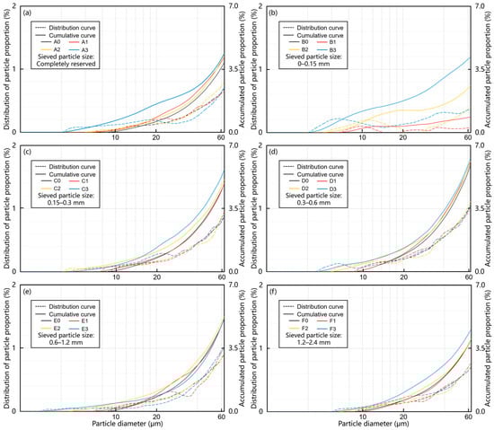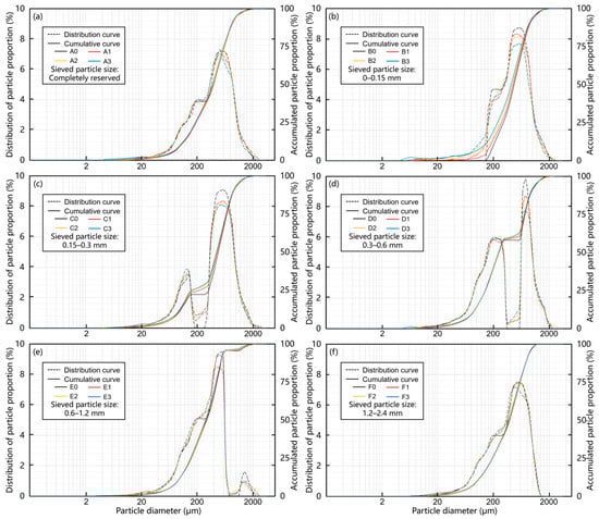 Particle distribution characteristics curve. (a) Group A; (b) Group B; (c) Group C; (d) Group D; (e) Group E; (f) Group F.