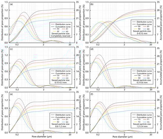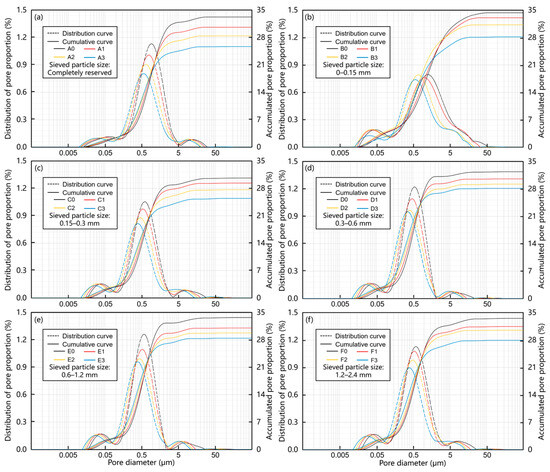 Pore distribution characteristics curve. (a) Group A; (b) Group B; (c) Group C; (d) Group D; (e) Group E; (f) Group F.