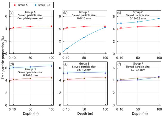 Depth–free particle proportion relationship. (a) Group A; (b) Group B; (c) Group C; (d) Group D; (e) Group E; (f) Group F.