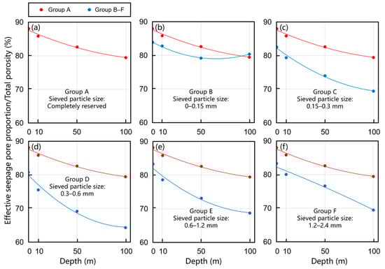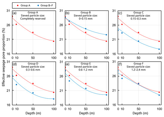 Depth–effective seepage pore proportion relationship. (a) Group A; (b) Group B; (c) Group C; (d) Group D; (e) Group E; (f) Group F.
