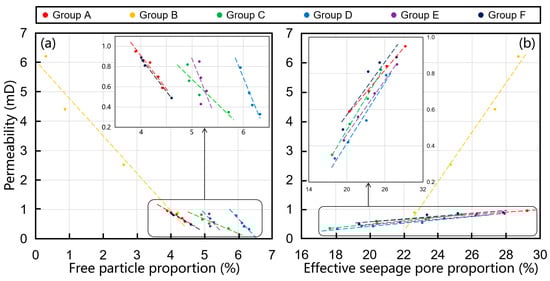 The analysis indicates that the variation characteristics of the permeability in each group of rock samples are correlated with the proportion of free particles and the proportion of effective seepage pores. However, the correlation patterns between the different sample groups are not the same. To further investigate the correlation patterns among these factors, scatter plots of free particle proportion–permeability and effective seepage pore proportion–permeability were established for different groups of rock samples, as shown in Figure 12.