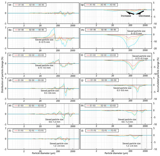 (a–f) Particle distribution difference curve of Group A−F; (g–l) cumulative particle distribution difference curve of Group A−F.