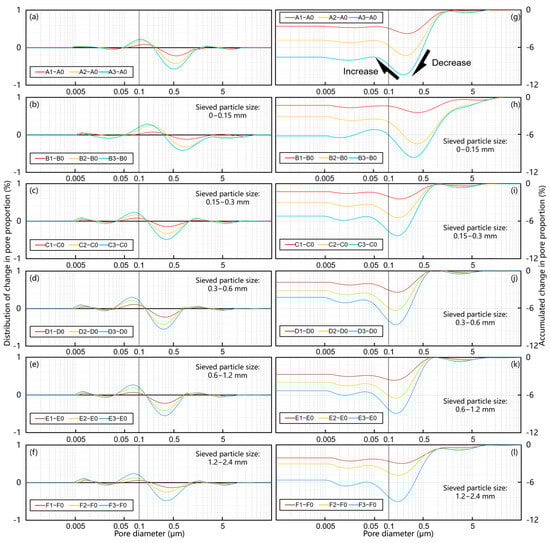 (a–f) Pore distribution difference curve of Group A−F; (g–l) cumulative pore distribution difference curve of Group A−F.