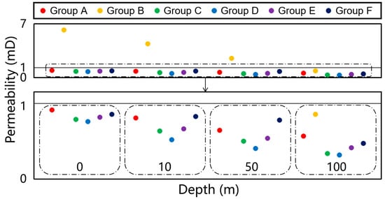 For sample Group A, the permeability gradually decreases with increasing depth, which is consistent with the trend of pore shrinkage due to increased ground pressure. For the other three sample groups (C, D, and E), the permeability is generally slightly lower than that of Group A, showing a similar decreasing trend. Notably, the initial permeability of sample Group B is extremely high, more than six times that of Group A, but it rapidly decreases with increasing ground pressure and reaches the same level as that of Group A at a depth of 100 m. Additionally, sample Group F shows stable permeability at shallow and medium depths, and it is generally greater than that of Group A, but as the depth increases to 100 m, its permeability rapidly decreases below that of Group A.