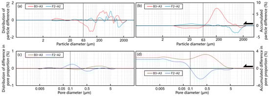 Taking B3 (Group B, 100 m burial depth) and F2 (Group F, 50 m burial depth) as the research objects, their particle size distribution and pore distribution curves are subtracted from the corresponding curves of A3 and A2, and the cumulative difference values are obtained for B3 and F2 relative to A3 and A2 in terms of the resulting particle and pore distribution curves, as shown in Figure 17.