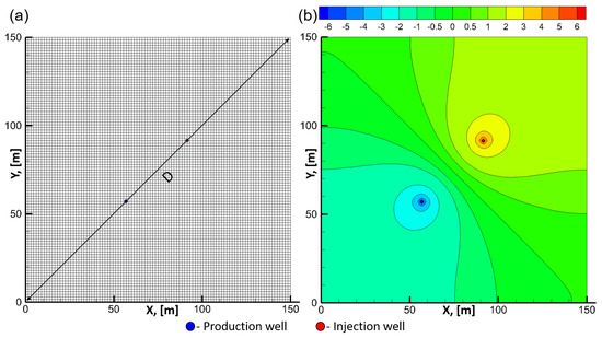 Calculation domain (a) and distribution of hydraulic pressure (b) at a distance between wells of 50 m.
