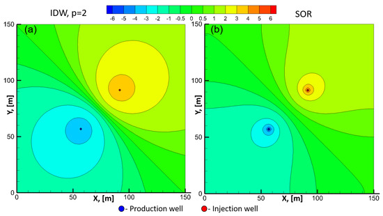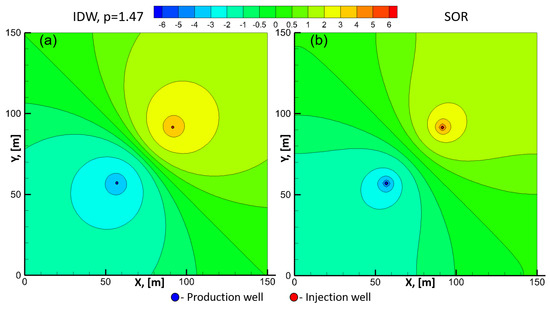 Table 2 presents the values of the power parameter p with the respective minimum number of iterations achieved for various distances between wells. Applying these optimized power parameter values in the interpolation of the initial approximation enabled a reduction in the computation time of Equation (3) by a factor of 2.49 to 2.78, depending on the distance between the wells.