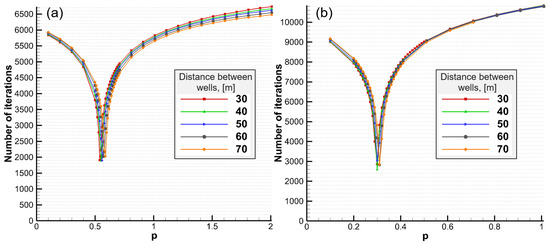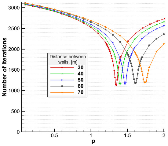 Similar calculations were performed with different values of the distance between wells for the computational grid as follows: 151 × 151 and 201 × 201. The calculations indicate that as the computational grid becomes denser, the influence of the distance between wells on the optimal power parameter p for minimizing iterations is significantly reduced (Figure 7). The power parameter p changes in the range of 0.54–0.59 and 0.3–0.31 on the computational grids 151 × 151 (Table 3) and 201 × 201 (Table 4), respectively.