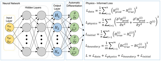 PINN models incorporate a mathematical representation of the physical process directly into the loss function of the neural network. This integration ensures that the physical processes are accurately modeled and upheld during the training phase. By training on both physical laws and empirical data derived from a mathematical model, as outlined by [34], PINNs are capable of predicting hydraulic head values across arbitrary computational grids. The implementation algorithm for the PINN model is depicted in Figure 8. The neural network architecture consists of an input layer that receives information regarding the coordinates of the injection and extraction wells. This is followed by two hidden layers, each comprising 250 neurons. The output layer generates an array of hydraulic head data. The output is then evaluated using a loss function, which, in the PINNs model, is a composite metric. This loss function accounts for several types of losses: data losses, physical losses, and losses associated with the initial and boundary conditions as follows [35,36]: