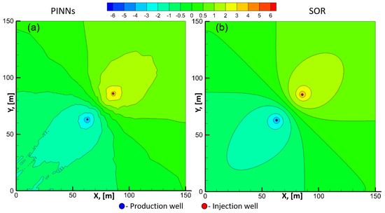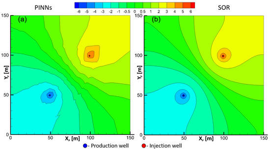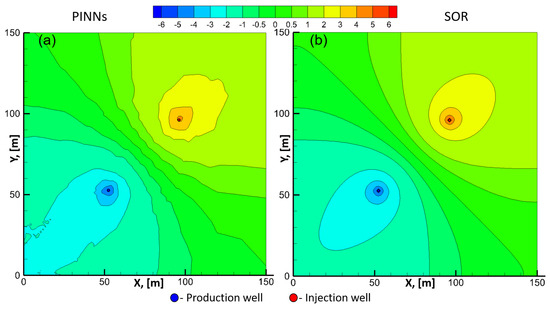 Distribution of the initial approximation of the hydraulic head determined by the PINN method (a) and the distribution of the hydrodynamic head calculated by the iterative SOR method (b) on a 101 × 101 computational grid with a distance between wells of 50 m.
