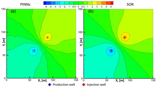 Initial approximation for hydraulic head distribution defined by PINNs (a) and hydraulic head calculated by SOR method (b) for a distance of 60 m between wells.