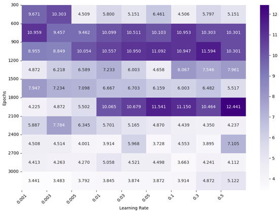 Figure 14 and Figure 15 show the dependence of time and maximum computational error on the learning rate and the number of epochs.