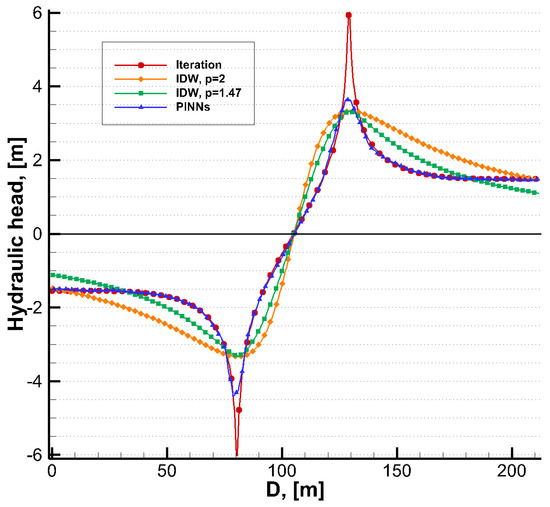 Figure 16 presents a comparison of the hydraulic head distributions along line D (refer to Figure 2), as calculated through iterative methods (red line), and initial approximations obtained using the IDW interpolation method with a power parameter (orange line) and the optimal value (green line), alongside the distribution generated by the PINN method (blue line) on a 101 × 101 computational grid.