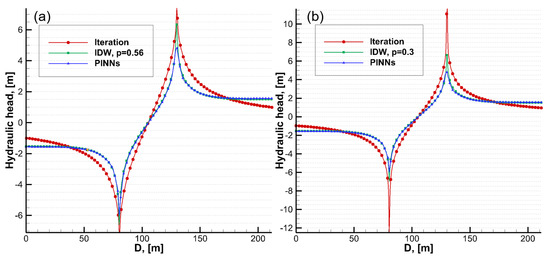 Distributions of hydraulic head determined by the IDW interpolation method with (a) and the iterative SOR method (b) at a distance between wells of 50 m.