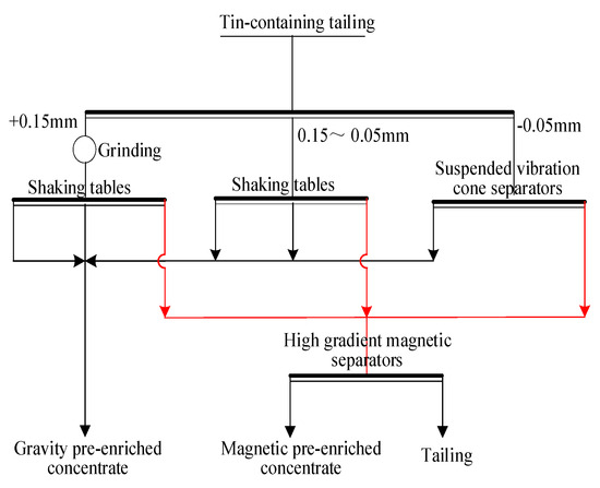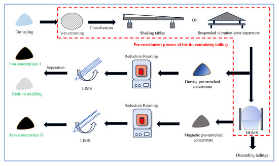 The pre-enrichment treatment of the tin tailings was carried out using the combined technology of gravity separation and magnetic separation. The tin tailings were divided into three particle sizes, including fine particles in the range of less than 0.05 mm, medium- grained particles in the range of 0.05 to 0.15 mm, and coarse-grained particles in the range of more than 0.15 mm. The coarse-grained particles underwent grinding to achieve a particle size of −0.074 mm, accounting for 95%. After that, grinding products were enriched using shaking tables. The medium-grained particles were processes directly using shaking tables. The fine particles went into the suspended vibration cone separators (Deshang mining, LXZ-1200, Kunming, China). The three concentrate products obtained above were mixed to yield the gravity pre-enriched concentrate. The tailings subject to gravity separation were treated using a high-gradient magnetic separator (HGMS, Jinhuan, Slon-100, Ganzhou, China) with 1.4 T magnetic field strength to obtain magnetic pre-enriched concentrates, and the magnetic tailings were discarded. The gravity pre-enriched concentrate was subject to reduction roasting convert hematite into magnetite. After that, the roasting products were treated using a low-intensity magnetic separator (LIMS, Liyuan, XCGS-Φ50, Nanchang, China) to obtain the iron concentrate Ⅰ and tin-rich middling. The magnetic pre-enriched concentrate was treated using reduction roasting and LIMS to obtain the iron concentrate Ⅱ. The technical route of treatment of the tin tailing is charted in Figure 2.