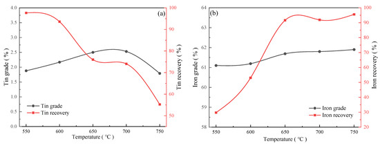 In order to clarify the effects of roasting temperatures on the separation of tin and iron, magnetic separation tests were carried out on the products obtained at different roasting temperatures. The lignite dosage was fixed at 10%, and the holding time was 40 min. The roasting temperatures were conditioned at 550, 600, 650, 700, and 750 °C. The results are presented in Figure 4. As shown in Figure 4a, the tin grade in the magnetic separation tailings gradually increased from 1.88% to 2.53% when the roasting temperature increased from 550 °C to 700 °C. However, the tin grade decreased to 1.79% when the roasting temperature rose to 750 °C. The tin recovery for the pre-enriched concentrate in the magnetic separation tailings gradually decreased from 97.65% to 55.24% when the roasting temperatures increased from 550 °C to 750 °C, suggesting that the conversion of SnO2 into SnO and its subsequent volatilization occurred readily under high temperatures [20]. The possible reactions of cassiterite at high temperatures are shown in Equations (1) and (2) [26].