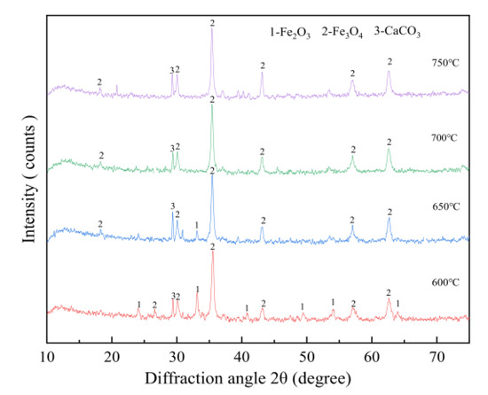 The XRD patterns of the roasted products at different temperatures are presented in Figure 5. Given that the contents of tin-containing minerals were less than the XRD detection limit, it was not detected [24]. However, it was observed that the diffraction peaks corresponding to hematite and magnetite were detected at a roasting temperature of 600 °C, indicating an incomplete reduction of hematite in the gravity pre-enriched concentrate during the reduction roasting process. As the temperature increased from 600 °C to 650 °C, the diffraction peak intensity of hematite gradually weakened, while that of magnetite increased. This was because the increase in the temperature promoted the transformation from hematite to magnetite, and the crystallization of magnetite gradually strengthens [27]. At temperatures as high as 700 °C or even 750 °C, no diffraction peaks associated with hematite were observed, confirming complete conversion of hematite into magnetite [28].