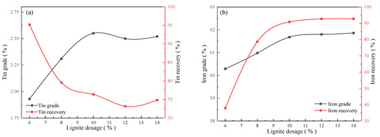 Effects of lignite dosages on tin recovery from the magnetic separation tailing (a) and iron recovery from the magnetic separation concentrate (b) (roasting temperature of 650 °C, holding time of 40 min).