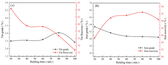 From Figure 7a, it was found that the tin recovery for the pre-enriched concentrates gradually decreased from 84.37% to 72.79% when the holding time during the roasting increased from 20 min to 100 min. As the holding time increased from 20 min to 60 min, the tin grade was almost constant. Nevertheless, the tin grade increased to 3.04% when the holding time was extended to 80 min. From Figure 7b, it can be observed that the recovery of iron increased first and then decreased, but the overall iron grade showed a slow decreasing trend. This situation may be due to the excessive holding time, which inevitably produced some magnetic inclusions, thereby reducing the recovery ratio and grade of the concentrate [30]. The iron grade and recovery for the pre-enriched concentrates in the magnetic separation concentrate were 60.62% and 92.41% when the holding time was fixed as 80 min. The results suggested that the roasting reaction required a certain holding time. A sufficient holding time was conducive to the improvement in iron recovery [31].