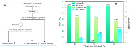 In order to further reduce the loss ratio of tin in the magnetic separation concentrate, the regrinding process and the second-stage low-intensity magnetic separation process were carried out, as charted in Figure 9a. The effects of regrinding fineness on the separation of tin and iron were studied, and the results are shown in Figure 9b. When the grinding fineness increased from 35% to 95% for particles smaller than 74 μm, the iron grade in the iron concentrate Ⅰ was maintained above 62%, but the iron recovery gradually decreased from 25.28% to 21.48%. Additionally, it was observed that the tin grade in the tin-rich middling Ⅱ reached 2.52%, and the overall recovery was 13.63% when the regrinding fineness was fixed at −74 μm accounting for 95%. Through grinding, other minerals can be further dissociated from the target mineral, thereby improving the recovery ratio of the target mineral [32]. Correspondingly, the grade and comprehensive recovery for iron in the iron concentrate Ⅰ reached 62.88% and 21.48%, respectively. Combining the tin-rich middling Ⅰ with tin grade of 3.04% and a comprehensive recovery of 57.25%, the average grade of tin and the comprehensive recovery from the tin-rich middling reached 2.93% and 70.88%, respectively.