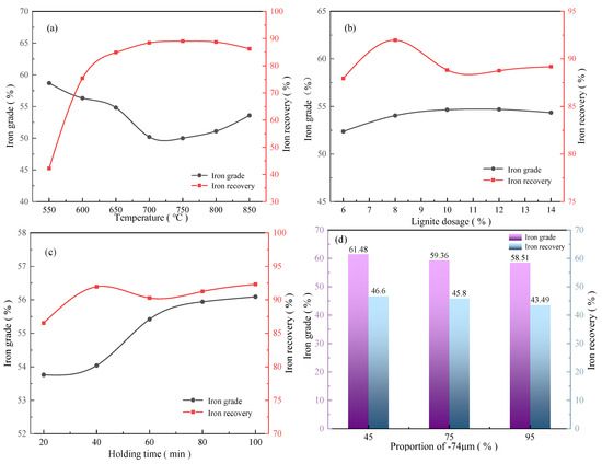 Effects of temperature (a), lignite dosage (b), holding time (c), and regrinding fineness (d) on iron recovery from the magnetic concentrate.