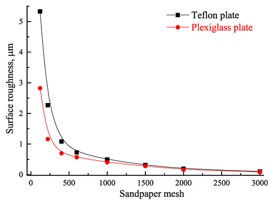 During the attachment of a rising bubble to a solid surface, the contact area between the bubble, whose diameter is within the order of millimeters, and the solid surface is small, and therefore the high uniformity of the surface of the solid is crucial to the reliability of experimental results. As a result, commercial plexiglass plates and polytetrafluoroethylene (Teflon) plates instead of the mineral plates were adopted as solid substrates in the present work. The measurement of the contact angles for the Teflon plates and plexiglass plates was conducted with a contact angle measurement instrument (Shanghai Zhongchen JC2000C1, Shanghai, China). The measurement indicated that the contact angle of the plexiglass plate was about 65.11°, while that of the Teflon plate was about 102.88°, as shown in Figure 2. Note that, in the present study, the plexiglass plate was considered as a hydrophilic surface, while the Teflon plates were used as a hydrophobic surface. To prepare solid plates with different surface roughness, the plexiglass and Teflon plates’ surfaces were fully polished using sandpaper with meshes of 120, 220, 400, 600, 1000, 1500, 2000 and 3000. The polished plexiglass plates were, respectively, recorded as P120, P220, P400, P600, P1000, P1500, P2000 and P3000, whereas the polished Teflon plates were recorded as T120, T220, T400, T600, T1000, T1500, T2000 and T3000, respectively. The surface topographies of the plexiglass and Teflon plates were characterized by an optical microscope and scanning electron microscope, while the surface roughness of the plates was quantitatively determined by a surface roughness measurer (Mitutoyo SJ–210, Mitutoyo Measuring Instruments (Shanghai) Co., Ltd, Shanghai, China). Figure 3 presents the surface topography of the polished Teflon plates, and Figure 4 gives the surface topography of the polished plexiglass plates. It can be intuitively observed that there is a significant difference in the surface roughness between the solid plates polished with different sandpapers. Figure 5 shows the roughness of the Teflon and plexiglass plates after polishing with sandpaper. It indicates that the surfaces of T3000 and P3000 were smooth, with a roughness of 0.102 and 0.089 μm, respectively. In contrast, T120 and P120 had rough surfaces, with a roughness of 5.331 and 2.824 μm, respectively.