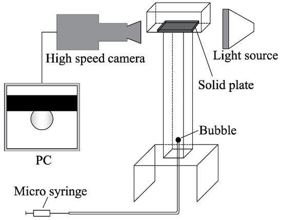 The experimental device used for observing the collision with and attachment of a bubble to the solid surfaces is shown in Figure 6. It mainly consists of a square column, a high–speed camera (i–SPEED 3, OLYMPUS, Tokyo, Japan) with a monitor, a non–stroboscopic light source, a microsyringe (GS1200, Gilmont, Gilmer, TX, USA) and a flat–headed needle with an inner diameter of 0.91 mm. The microsyringe has an accuracy of 0.002 mL, and it was used to generate an air bubble with a diameter of about 3.5 ± 0.1 mm using a flat–headed needle in the aqueous phase. In a typical experiment, the plexiglass or Teflon plates were horizontally fixed and immersed in deionized water, as shown in Figure 6. The high–speed camera was used to monitor the collision and attachment of bubbles to the plexiglass/Teflon plates, and the frame rate of fast video recordings was fixed at 750 fps. Additionally, it should be pointed out that the lower surface of plexiglass or Teflon plate is about 200 mm away from the point of the bubble formation (i.e., the needle). The software Image Pro Plus 6.0 was adopted for the data processing. Specifically, the video obtained by the high–speed camera was first converted into sequential images with the software i–SPEED Suite. The automatic tracking function in Image Pro Plus 6.0 was used to capture and record the trajectory of the air bubble, and therefore, the instantaneous velocity of bubble was attained. The moment when TPC is formed can be easily and clearly determined in a slow playback of the video using the software Image Pro Plus, and therefore the frame corresponding to this moment is determined as the one when the TPC occurs. Moreover, the measurement function in Image Pro Plus 6.0 was adopted to analyze the TPC line length of the bubble attachment to the solid surface.