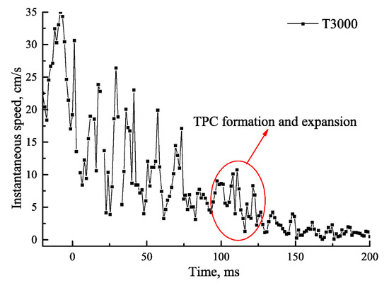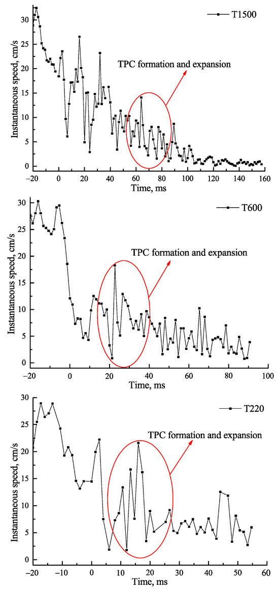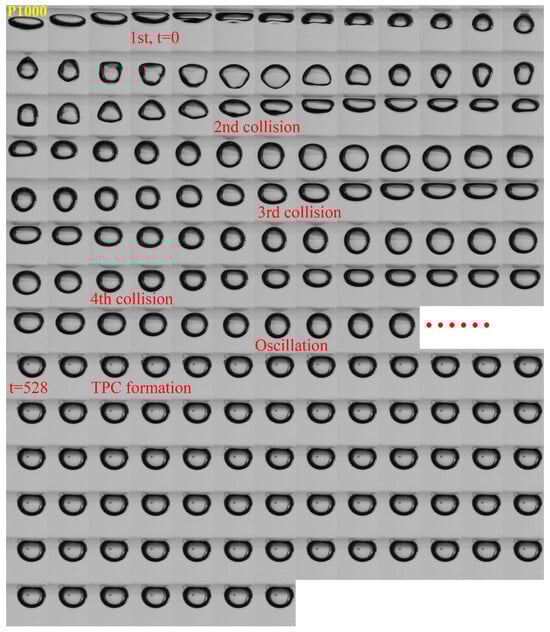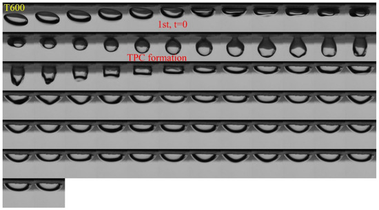 As shown in Figure 7, the “collision–bounce” cycles of the bubble, the amplitude of bounce and the degree of deformation of the bubble can be easily and clearly observed through the video obtained by the high–speed camera recording the dynamic process of the attachment between the bubble and the solid plates. Specifically, the moments when the bubble collides with and bounces from the solid surface can be clearly determined by a slow playback of the video using the software Image Pro Plus, and therefore the frames corresponding to these moments can be determined. For the smooth T3000 surface with a roughness of 0.102 μm, the bubble bounced two times before TPC formation. During “collision–bounce” cycles, the velocity and the “amplitude” of the bounce and the degree of deformation in the bubble gradually decreased due to the dissipation of kinetic energy associated with the bubble’s motion. During the third collision with the T3000 surface, permanent contact of the bubble with T3000 surface was attained. Then, the bubble experienced a process of “oscillation in vertical direction” lasting about 21.33 ms at the T3000 surface (see Figure 7 and Figure 11), and during this event, most of the residual kinetic energy of the bubble was consumed. At approximately the 95th ms, the wetting film between the bubble and T3000 was ruptured and TPC nucleus or hole was formed, followed by the expansion of the TPC which lasted for about 31 ms. Finally, the bubble adhered to the T3000 surface, which was reflected by a sudden variation in the instantaneous velocity of the bubble between 95 and 125 ms in Figure 11. In contrast, for the T1500 surface with a roughness of 0.316 μm, the bubble bounced one time before TPC formation (see Figure 8). The bubble was captured by the T1500 surface in the case of the bubble with large residual kinetic energy (with a maximum oscillation velocity exceeding 10 cm/s) after the second collision, as shown in Figure 8 and Figure 11. It was found that the rupture of the wetting film (i.e., TPC formation) occurred at an earlier time (the 53rd ms), which was 42 ms ahead of that for the T3000 surface. At the T600 and T220 surfaces with a surface roughness of 0.729 μm and 5.331 μm, respectively, permanent contact with the bubble was immediately obtained during the first collision (no bubble bounce), as shown in Figure 9 and Figure 10. For the T600 surface, TPC was formed in the 15th ms after a process of bubble oscillation which lasted for about 10 ms. At the T220 surface, TPC was formed in the 5th ms and TPC spreading was completed at the 25th ms.