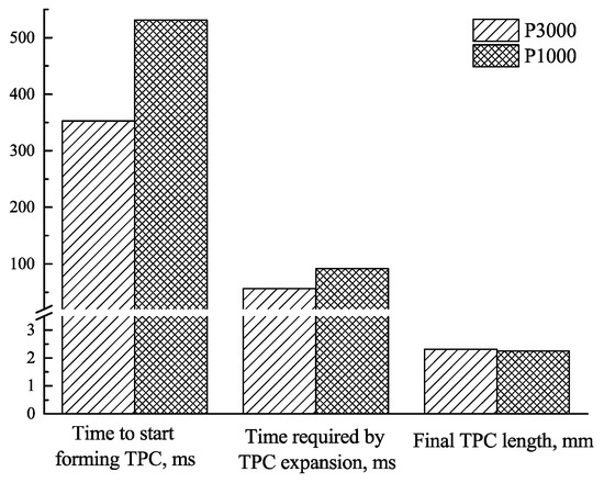 Figure 12 illustrates the characteristics of the bubbles’ attachment to the Teflon plates. As shown in Figure 12, the timescales of bubble attachment to Teflon plates strongly depended on the surface roughness, and the time point of TPC formation at the Teflon surfaces was gradually advanced with the increased surface roughness. Additionally, it was found that it took approximately 31 ms to finish TPC expansion at the smooth T3000 surface. With the increased roughness, the time required for TPC expansion on the T1500, T600 and T220 surfaces was decreased to 29, 25 and 19 ms, respectively. On the contrary, the final lengths of the TPC formed on the Teflon surfaces was increased from 3.96 mm to 5.85 mm with the increase in roughness (see Figure 12), improving the strength of the attachment between the bubbles and the Teflon surface. It should be noted that, in this study, the length of the TPC was determined as the horizontal projection of the TPC (i.e., TPC diameter) formed by the bubble adhering to the solid surface. In summary, for the hydrophobic Teflon plates, the increase in roughness greatly accelerated the thinning and rupture of the wetting film formed on the Teflon plate, and thereby promoted the formation and expansion of TPC, enhancing the attachment of the bubbles to the Teflon surface.