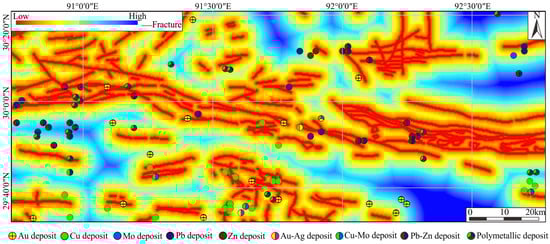 Fracture is an important ore-controlling factor, which can provide a method and space for mineralization. Since most deposits are located on the side of the main fracture, an analysis of the fracture distance can reveal a favorable environment for mineralization around the fracture on a regional scale. Therefore, this study uses fracture distance to describe the spatial relationships between deposits and fractures (Figure 3). Areas closer to faults are assigned smaller values, which are represented in red on the map, while areas farther from faults are assigned larger values, which are represented in blue. Most mineralization is located in the red low-value areas.