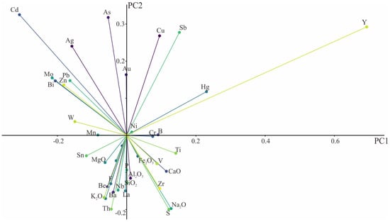 Principal component analysis (PCA) was performed on the 39 elements after clr log-ratio transformation. In the biplot (Figure 5), among the 39 elements, 14 elements show positive values on the first principal component. The elements with higher loadings in PC1 are Y and Hg. The elements with high loads in PC2 are As, Ag, Cd, Sb, and Cu. The elements in the first quadrant are related to Cu mineralization, and the occurrence of Ni and Cr may also be related to basic and ultrabasic rocks. The elements appearing in the second quadrant are related to Au mineralization [64,65]. Au, As, Sb, Hg, Pb, and Zn are used as indicator elements for gold and lead–zinc deposits. In addition, W, Mo, and Bi, as typical high-temperature elements, appear together in the second quadrant, which may indicate the existence of deposits related to the magmatic–hydrothermal fluid to a certain extent [65,66]. The elements in the third quadrant may be related to the stratigraphic distribution. The Al2O3 and SiO2 elements in the third quadrant are the main constituent elements of granite and Linzizong volcanic rocks in the area. MgO has a higher content in the Laigu Formation dolomite and Songduo group. The distribution characteristics of the elements are closely related to the lithology of the strata. The iron group elements (Fe2O3, V, Ti) appearing in the fourth quadrant may be related to basic and ultrabasic rocks [65,66]. From the data-driven results, the positive load of the PC2 contains Cu, Au, Ag, Mo, Pb, Zn, and other elements, which is related to polymetallic mineralization in the study area. This finding confirms the existence of certain correlations among the metallogenic elements.
