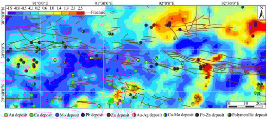 Based on the above analysis, an association of elements reflecting Mn-Ag-Pb-Cd-As-Sn-W-Cu-Sb-Mo-Au-Zn polymetallic mineralization in the study area is extracted using the compositional data analysis [65]. The main metallogenic elements in the study area include Cu, Mo, Pb, Zn, Au, Ag and W [41]. As shown in Figure 6, about 60% of the mineral deposits fall within the range of 1.0 (yellow in the figure) or above.